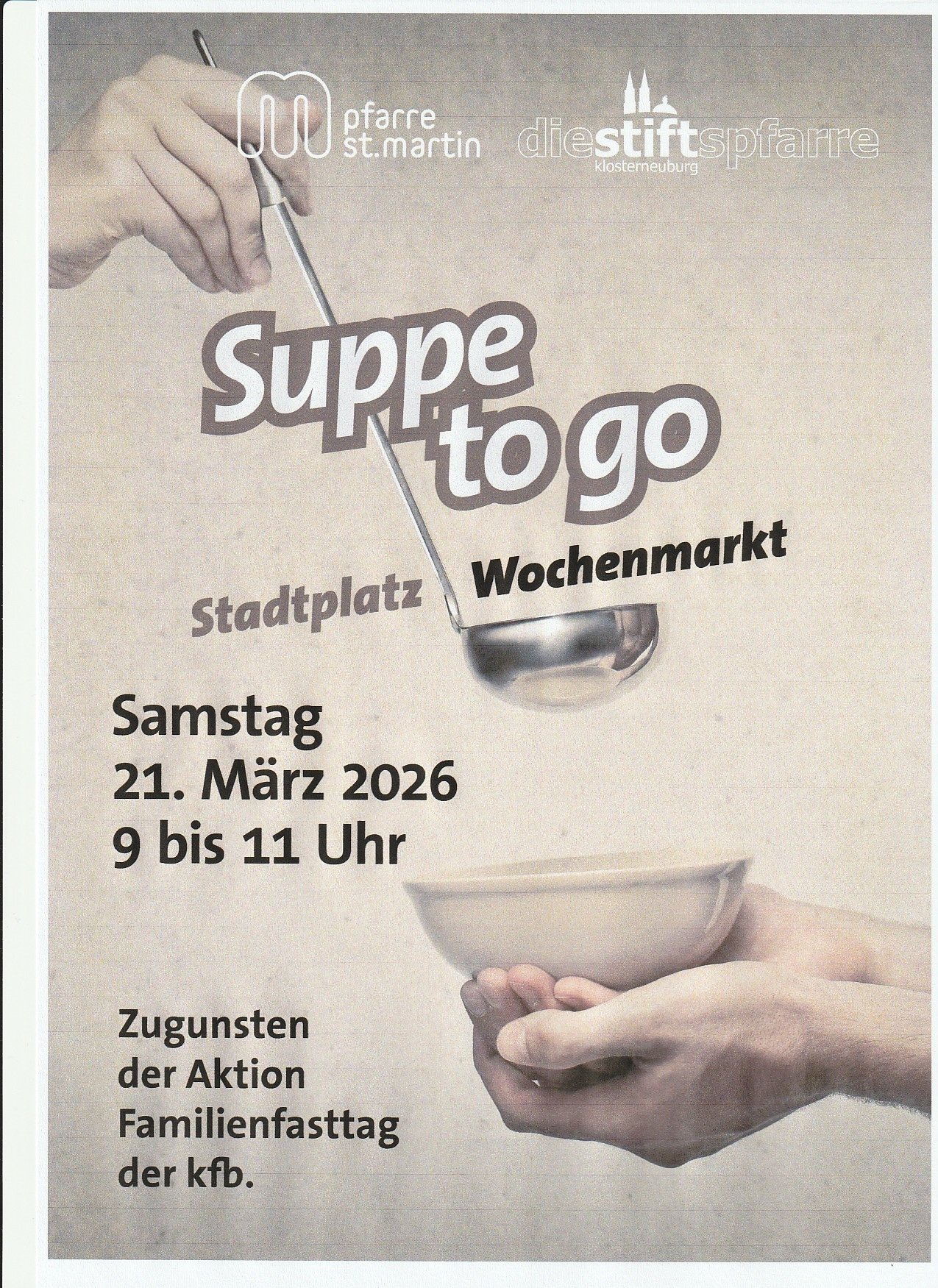 Die Pfarren St. Martin und die Stiftspfarre gehen am Samstag, 21. März 2026 wieder hinaus zu den Menschen und unterstützen gemeinsam durch das Projekt „Suppe to go“ die Aktion Familienfasttag der katholischen Frauenbewegung.